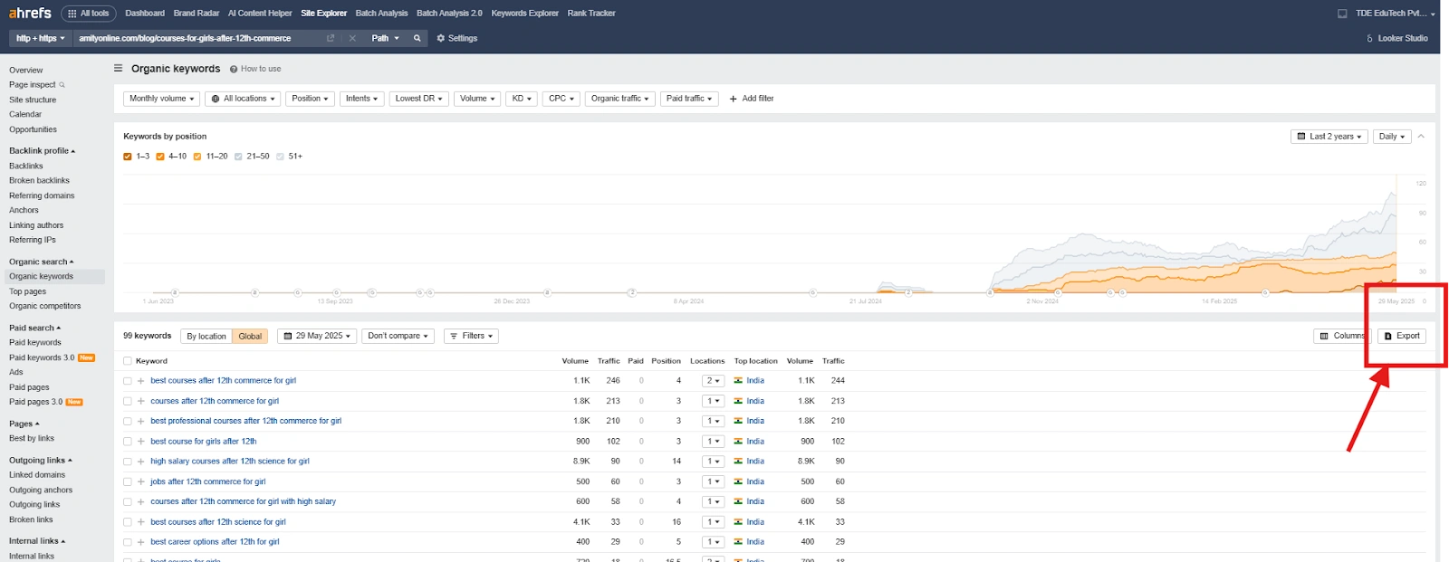 Once you find useful keywords from your competitor’s pages, download the list using Ahrefs. You can use these to build your own keyword map, and decide which keywords to use in your blog, headings, and content body. This saves time, shows you real-world results, and helps you stay one step ahead.